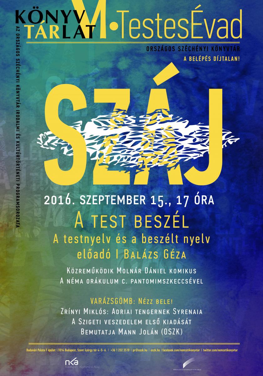 Az est a TestesÉvad nyitó eseménye. Könyvtárunk ingyenes irodalmi és kultúrtörténeti programsorozata a 2016/2017-es évadban a TESTről szól a művészetek és a tudományok, vagy egyszerűen csak a lélek szemszögéből: SZÁJ, TEKINTET, LÁB, MÁJ, SZÍV, HAJ, AGY és LÉLEK – ezek a havonta jelentkező estek címszavai.