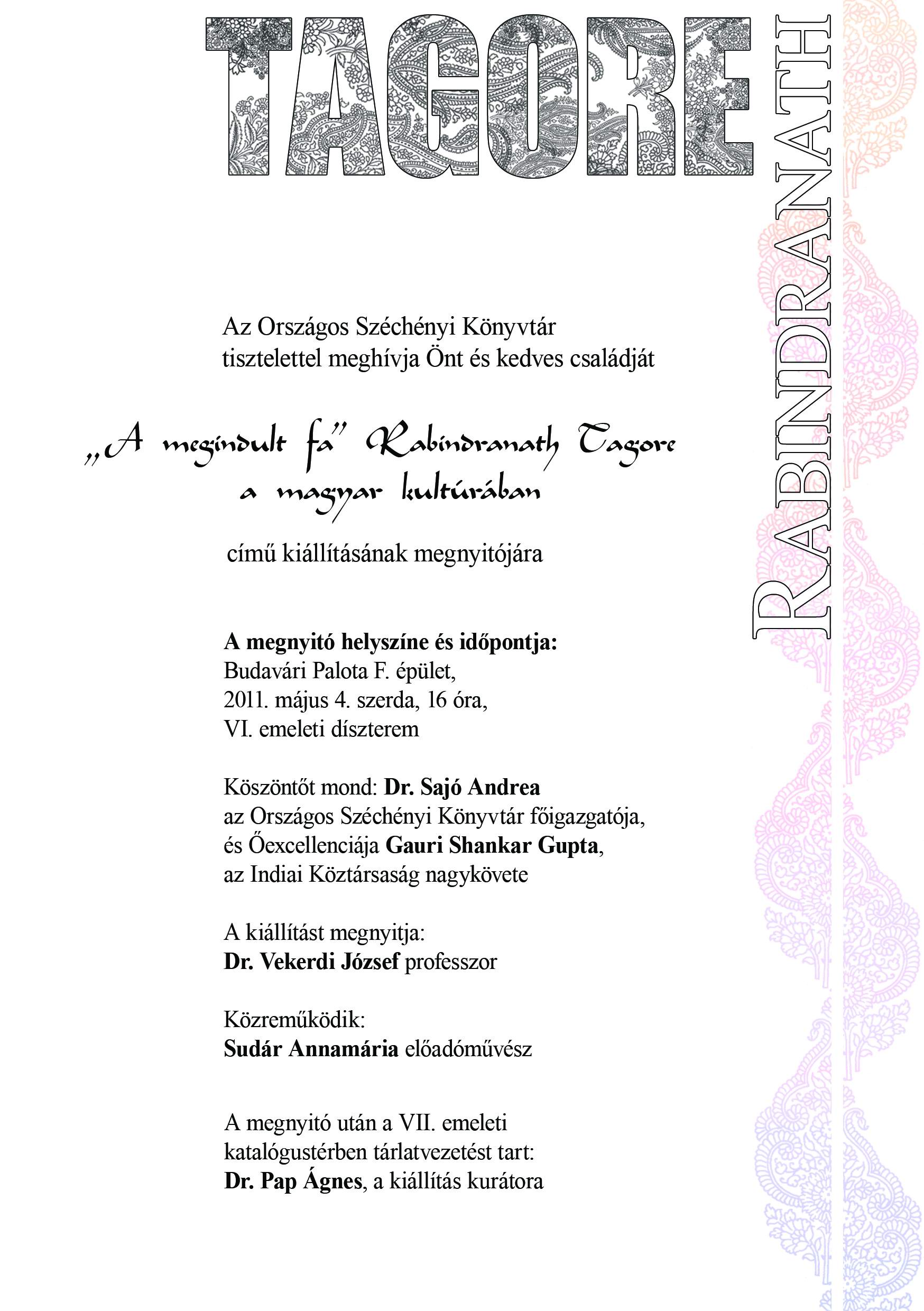 Az Országos Széchényi Könyvtár kiállítást rendez a Nobel-díjas (1913) indiai költő és gondolkodó Rabíndranáth Tagore (1861-1941) születésének 150. évfordulója tiszteletére. A tárlat kurátora Dr. Pap Ágnes (OSZK). Társrendezők, illetve szakmai tanácsadók Dr. Bangha Imre, Dr. Bethlenfalvy Géza, Dr. Vekerdi József, Dr. Wojtilla Gyula indológusok.
