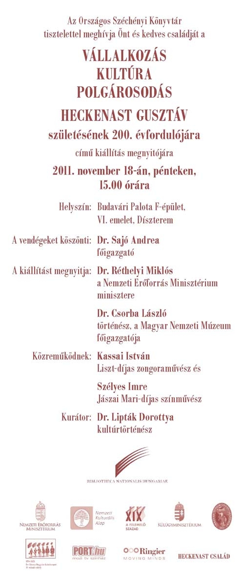 Az Országos Széchényi Könyvtár és az MTA–OSZK Res libraria Hungariae Kutatócsoport 19. századi műhelye Vállalkozás, kultúra, polgárosodás címmel közös kiállítást rendez Heckenast Gusztáv (1811–1878) születésének 200. évfordulója tiszteletére.