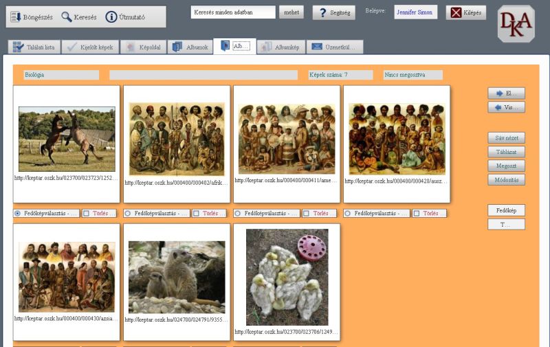 A DKA legfrissebb újdonsága a Képalbum [8] nevű felület, amellyel saját válogatásokat (albumokat) állíthatunk össze és oszthatunk meg másokkal. Emellett a képeket címkézhetjük, pontozhatjuk, megjegyzéseket fűzhetünk hozzájuk, vagy elküldhetjük képeslapként. A Képalbumba a http://dka.oszk.hu/html/kepalbum.php [8] oldalon lehet belépni. Külön regisztráció nincs, a meglévő Facebook vagy Google (Gmail) azonosítónkat használhatjuk. Van anonim hozzáférés is, de akkor nem maradnak meg a változtatások és nem minden funkció működik. A felület a Qooxdoo nevű korszerű fejlesztőeszközzel készült, egyelőre kísérleti üzemmódban működik, de a jövőben további fejlesztések, újabb funkciók várhatók. Ötleteket, megjegyzéseket a DKA e-posta címére [9] várunk.