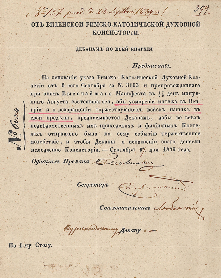 A Római Katolikus Papi Kollégium N 3103 számú, szeptember 6-án [szeptember 19.] kelt rendelete s Ő Cári Felségének abban foglalt, augusztus 17/29-i keltezésű Manifesztuma alapján, amelyet a magyarországi lázadás leveréséről és győzedelmes seregeinknek országunkba való hazatéréséről adott ki, előírattatik az espereseknek, hogy eme esemény okán az összes, illetékességük alá tartozó plébániatemplomban és kápolnában ünnepélyes hálaadó istentisztelet tartassék, és az esperesek haladéktalanul jelentsék a Konzisztóriumnak ennek megtörténtét.