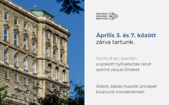 Felhívjuk kedves olvasóink és látogatóink figyelmét, hogy könyvtárunk 2026. április 3. és 7. között zárva tart.