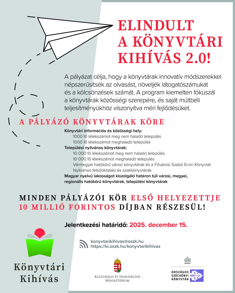 A Könyvtári Kihívás 2025–2026 pályázat az eredményes 2024–2025. évi Könyvtári Kihívás megújítása azzal a céllal, hogy a nyilvános könyvtárak innovatív módszereiket úgy fejlesszék tovább az olvasás-népszerűsítésben, hogy az a látogatók és a kölcsönzések számának növekedésében is tükröződjék. A program elvárt eredménye, hogy a könyvtárak közösségi szerepe és társadalmi beágyazódása erősödjék, ezért az intézmények fejlődését saját múltbéli teljesítményükhöz viszonyítva értékeli.