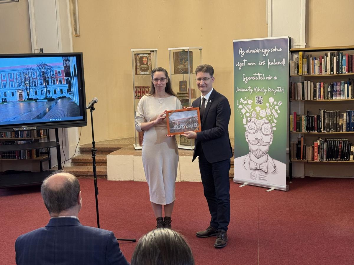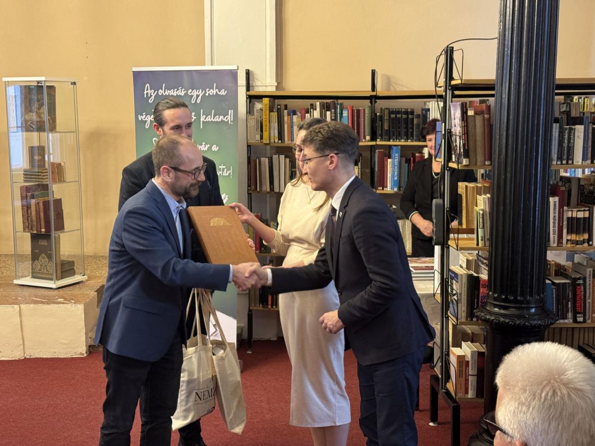 Ezt követően Lewalt-Jezierski Zoltán és dr. Szüts Etele, az OSZK Könyvtári Intézetének igazgatója átadták a nemzeti könyvtár ajándékát: egy különleges könyvcsomagot, amely az intézmény saját, valamint partnerintézeteinek új kiadványait foglalta magába. A csomag legkiemelkedőbb darabja a Mátyás király könyvtárából származó Philostratus-corvina fakszimile kiadása volt. Az impozáns kötet a tervek szerint hamarosan megtekinthető lesz a Vörösmarty Mihály Könyvtár olvasótermében.