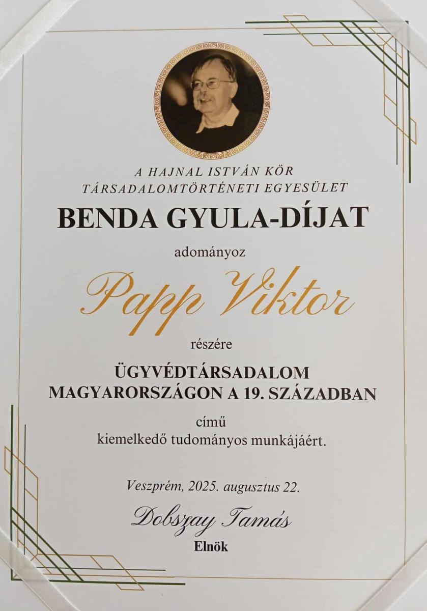 2025. augusztus 22-én a Veszprémi Érseki Főiskola adott otthont a Hajnal István Kör Társadalomtörténeti Egyesület éves konferenciájának, amely ezúttal a „Csend, hallgatás, elhallgatás” címet viselte. Az eseményen került sor a rangos Benda Gyula-díj átadására, amelyet idén Papp Viktor, az MNMKK Országos Széchényi Könyvtár Történeti Fénykép- és Interjútár munkatársa nyert el.