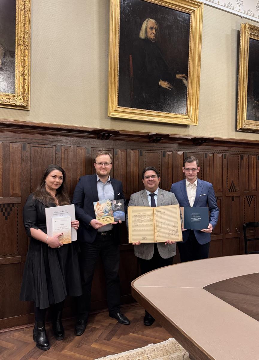 1. kép – Jobbról balra: Farkas Gábor Liszt Ferenc-díjas zongoraművész, a Zeneakadémia rektora, Rózsa Dávid, az OSZK főigazgatója, Laskai Anna, az OSZK Színháztörténeti és Zeneműtárának osztályvezetője, Cselényi Máté, a Liszt Ferenc Emlékmúzeum és Kutatóközpont igazgatója, fotó: OSZK