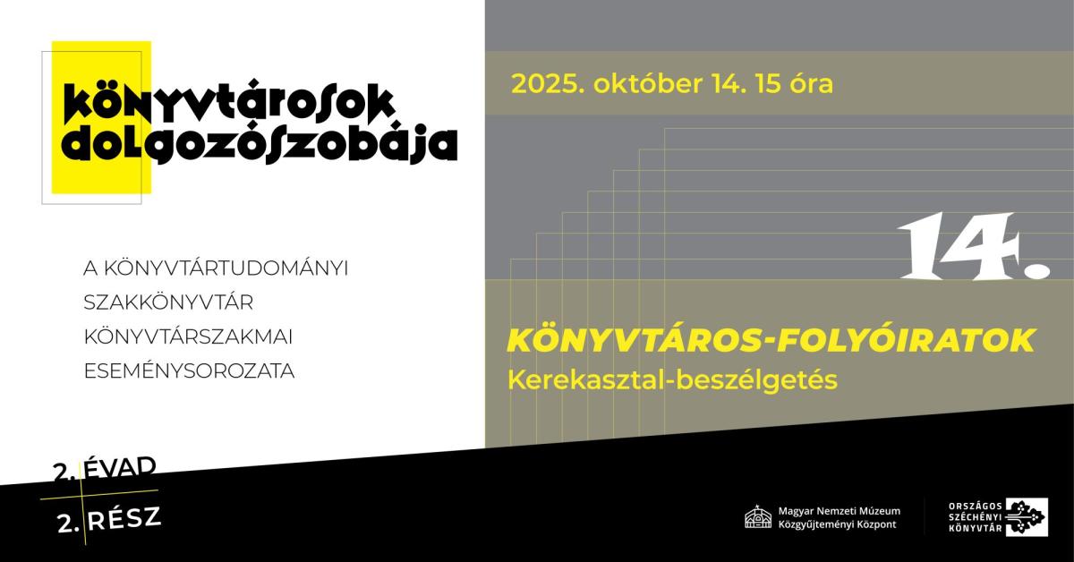A Könyvtártudományi Szakkönyvtár 2025. október 14-én, kedden 15 órakor tartja a Könyvtárosok dolgozószobája elnevezésű könyvtárszakmai eseménysorozat tizennegyedik rendezvényét.