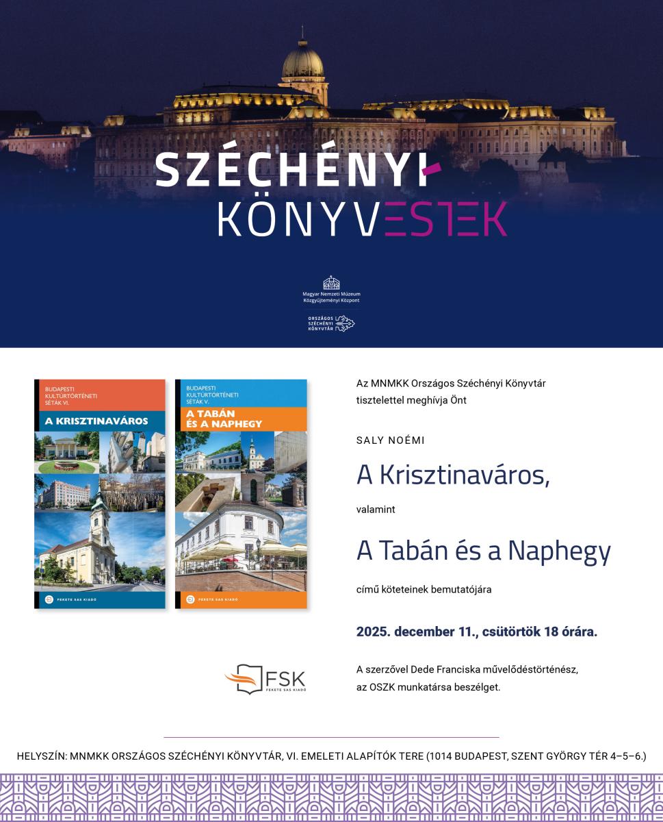 Széchényi-könyvestek rendezvénysorozatunkban a tizedik alkalommal Saly Noémi frissen megjelenő, A Krisztinaváros, illetve A Tabán és a Naphegy című köteteit mutatjuk be. A szerző beszélgetőtársa Dede Franciska művelődéstörténész, az OSZK munkatársa lesz.