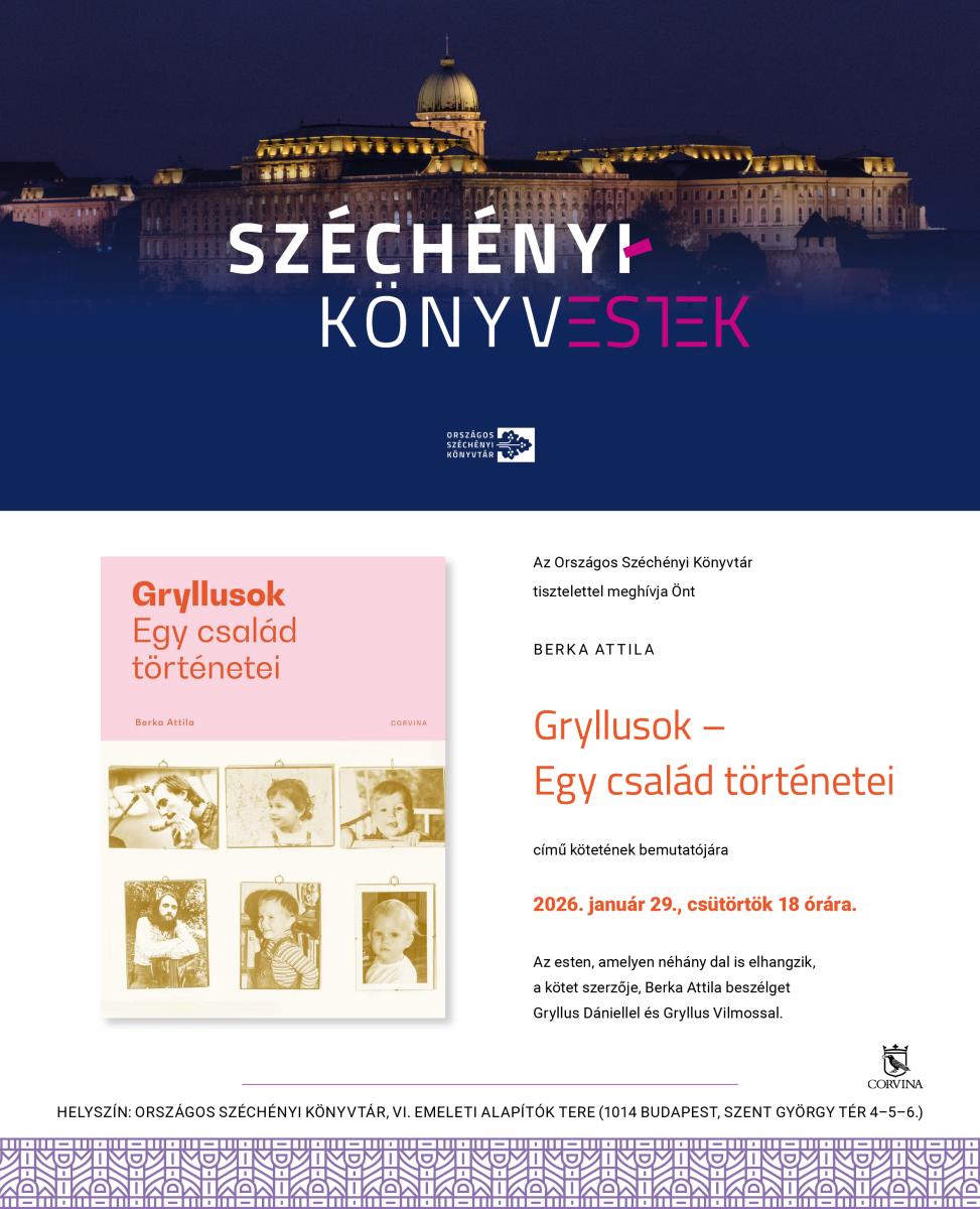 Széchényi-könyvestek című programsorozatunk következő rendezvényén a Gryllusok – Egy család történetei című kötetet mutatjuk be. Az esten, amelyen néhány dal is elhangzik, a kötet szerzője, Berka Attila beszélget Gryllus Dániellel és Gryllus Vilmossal.