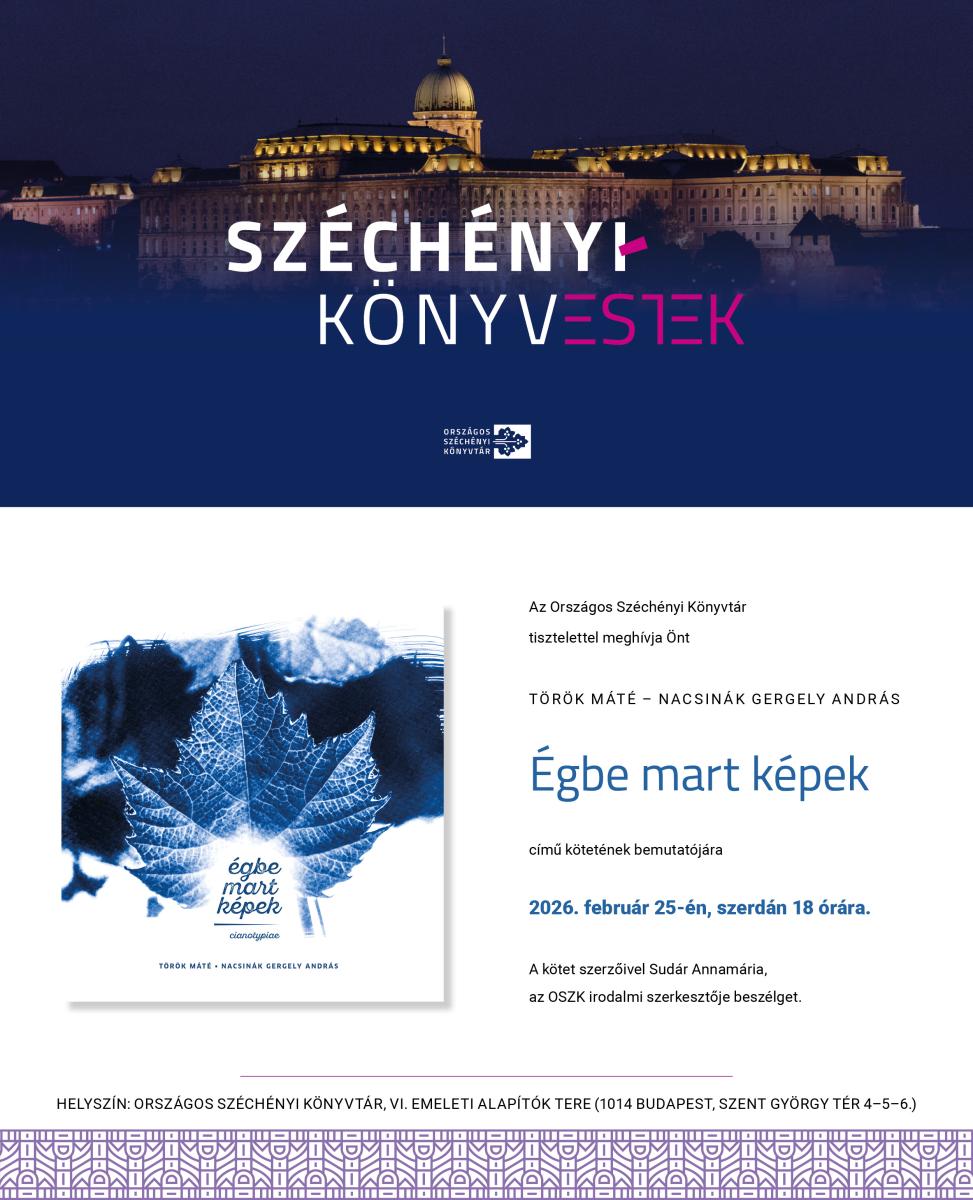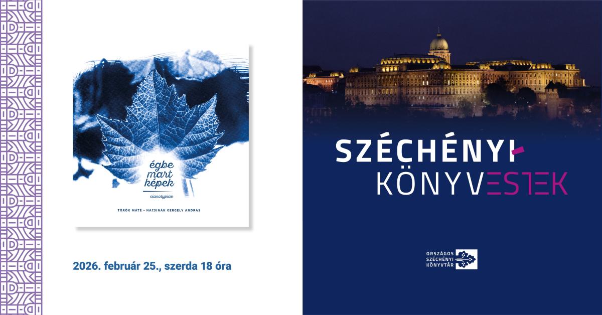 A Széchényi-könyvestek következő rendezvényén az Égbe mart képek című, 2025-ben megjelent kötet szerzőivel Sudár Annamária, az OSZK irodalmi szerkesztője beszélget. Török Máté verséneklő, előadóművész, fotográfus cianotípiáihoz Nacsinák Gergely András író, költő, ortodox pap álmodott szövegeket.