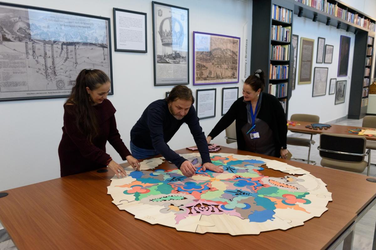 Óriás kirakókkal játszhatunk Gondos Gábor és a Gondosdesign jóvoltából. A kisebb és nagyobb, akár 180 centiméter átmérőjű, esztétikus – corvinaminta ihlette, arab ornamentikát idéző vagy fraktálszerű – közösségi játékok többféleképpen megoldhatók, így a résztvevők saját kompozíciókat is készíthetnek.